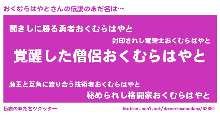 | 男性向けラノベタイトル風あだ名 | 『おくむらはやと~年齢イコール彼女いない歴の魔法使い~』 |