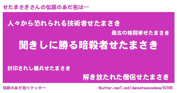 | 男性向けラノベタイトル風あだ名 | 『魔弾の王とせたまさき』 |