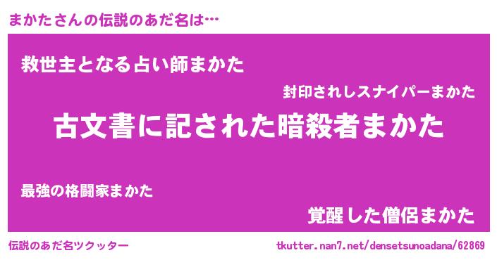 | 男性向けラノベタイトル風あだ名 | 『まかたに滅ぼされるだけの簡単なお仕事です』 |