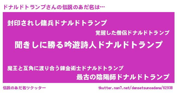 | 男性向けラノベタイトル風あだ名 | 『ドナルドトランプという概念が存在しない退屈な世界 』 |