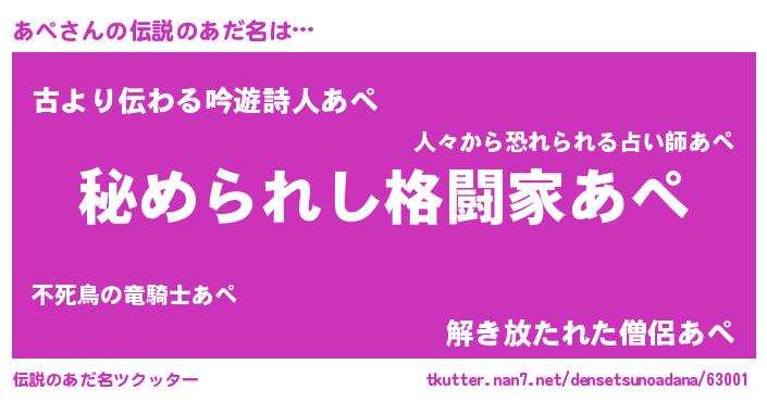 | 男性向けラノベタイトル風あだ名 | 『やはりあぺの青春ラブコメはまちがっている 』 |