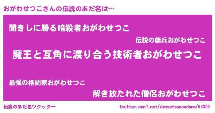 女子向けラノベタイトル風あだ名 | 『婚約破棄系悪役おがわせつこに転生したので、保身に走りました。』 |