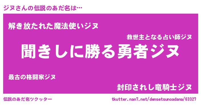 | 男性向けラノベタイトル風あだ名 | 『ジヌという概念が存在しない退屈な世界 』 |