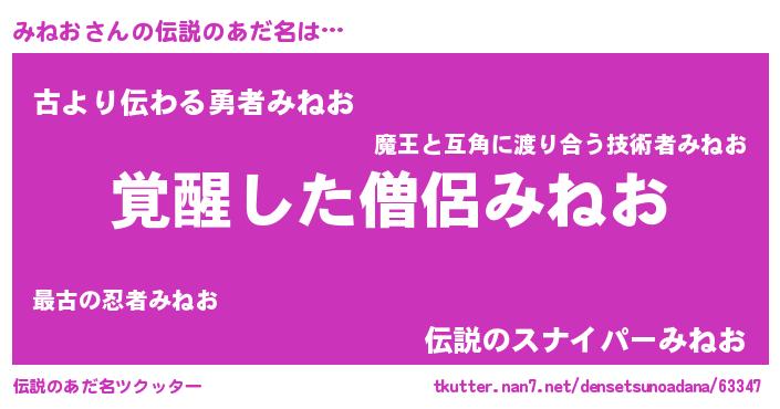 | 男性向けラノベタイトル風あだ名 | 『みねお~年齢イコール彼女いない歴の魔法使い~』 |