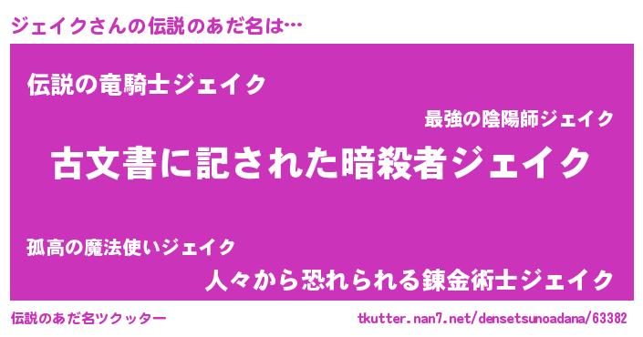 | ヒーロー風カッコイイあだ名 | 『ネオジェイク』『最強戦士ジェイク』 |