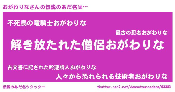 | 男性向けラノベタイトル風あだ名 | 『転生したらおがわりなだった件』 |