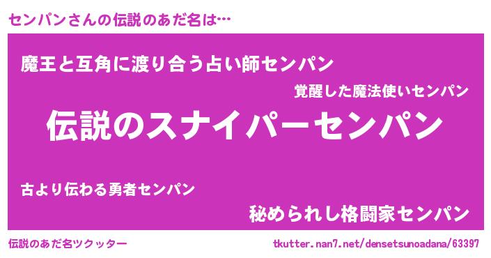 | 男性向けラノベタイトル風あだ名 | 『センパンの憂鬱』『魔弾の王とセンパン』 |