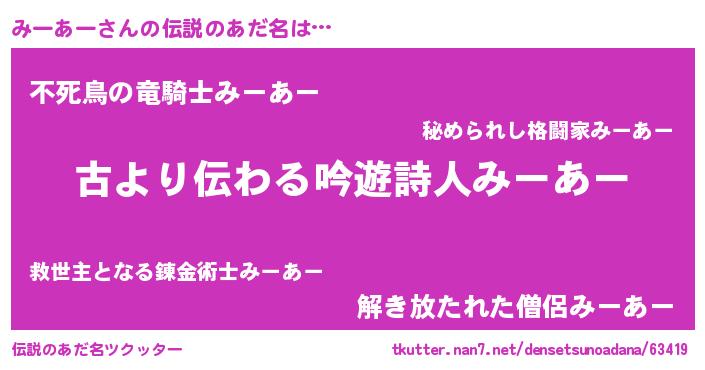 | 男性向けラノベタイトル風あだ名 | 『この素晴らしい世界にみーあーを!』 |