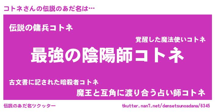 | 女子向けラノベタイトル風あだ名 | 『悪役コトネに転生したようですが、知った事ではありません』 |