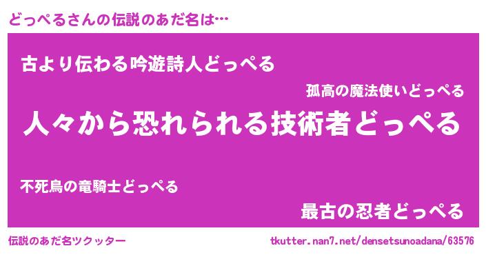 | 男性向けラノベタイトル風あだ名 | 『おまえをオタクにしてやるから、俺をどっぺるにしてくれ! 』 |