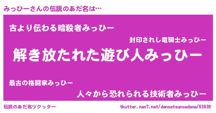 | 女子向けラノベタイトル風あだ名 | 『みっひーの卵を拾いまして』 |