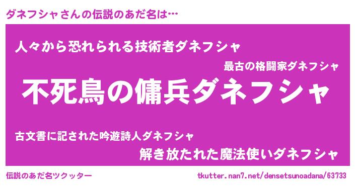 | 男性向けラノベタイトル風あだ名 | 『Re:ダネフシャから始める異世界生活』 |