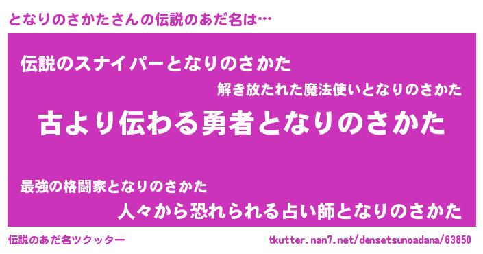| 男性向けラノベタイトル風あだ名 | 『となりのさかたに滅ぼされるだけの簡単なお仕事です』 |