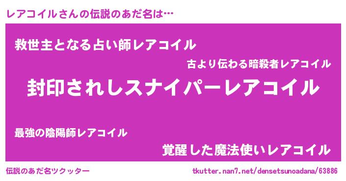 | 意味不明あだ名 | 『住所不定無職レアコイル(77歳)』 |