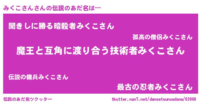 | 意味不明あだ名 | 『自称みくこさん』『永久保存みくこさん』 |