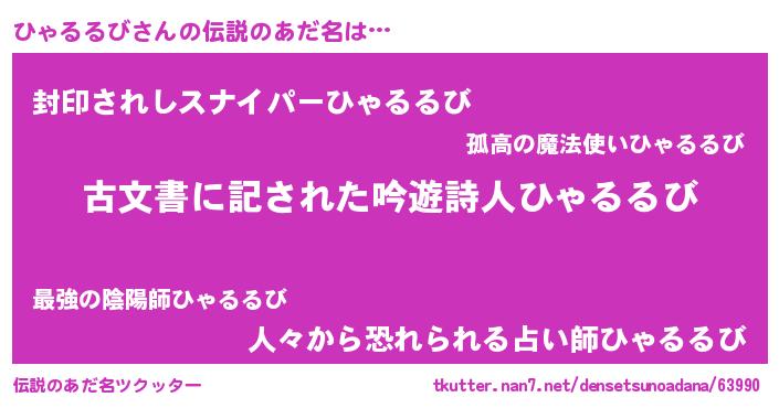 | 男性向けラノベタイトル風あだ名 | 『うちのひゃるるびが世界を掌握している!』 |