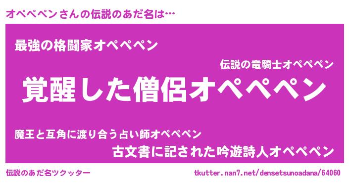 | 男性向けラノベタイトル風あだ名 | 『オペペペンの嫁は女の子じゃないと思った?』 |