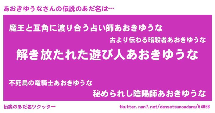 | 男性向けラノベタイトル風あだ名 | 『あおきゆうなの嫁は女の子じゃないと思った?』 |
