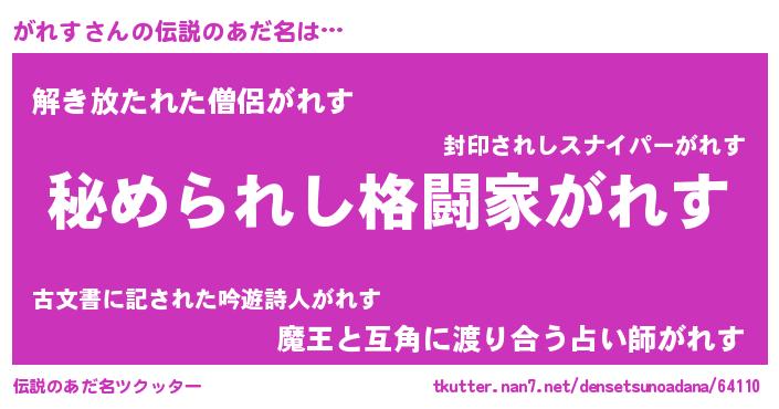 | 意味不明あだ名 | 『がれすフォーエバー』『自称がれす』 |
