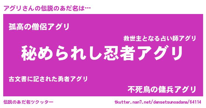 | 女子向けラノベタイトル風あだ名 | 『アグリの雑貨屋さん』『闇のアグリ』 |