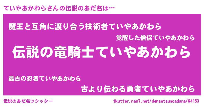 | 男性向けラノベタイトル風あだ名 | 『テイヤアカワラスレイヤー』 |