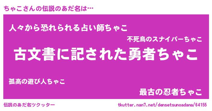| ヒーロー風カッコイイあだ名 | 『ネオチャコ』『正義の使者ちゃこ』 |