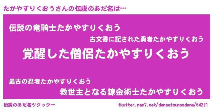 | 意味不明あだ名 | 『とにかく怪しいたかやすりくおう』 |
