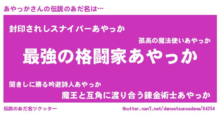 | 男性向けラノベタイトル風あだ名 | 『あやっかに滅ぼされるだけの簡単なお仕事です』 |