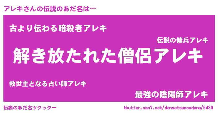 | ヒーロー風カッコイイあだ名 | 『ウルトラ戦士アレキ』『魔戒騎士アレ』 |