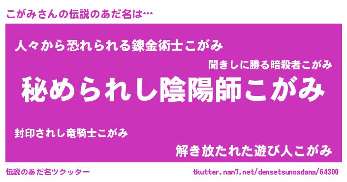 | 男性向けラノベタイトル風あだ名 | 『はたらくこがみさま!』『緋弾のコガミ』 |