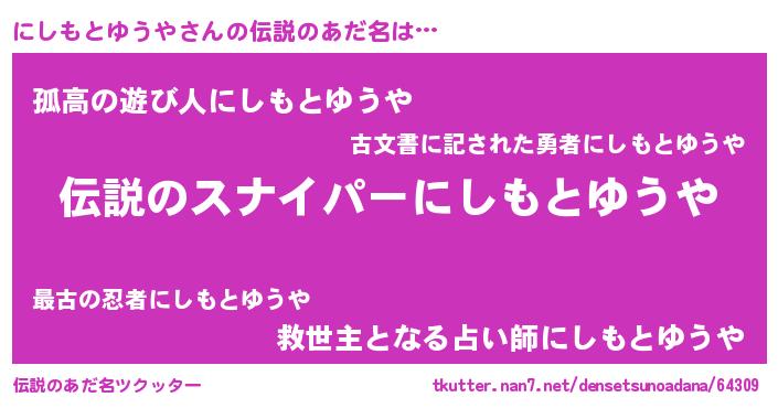 | 男性向けラノベタイトル風あだ名 | 『魔弾の王とにしもとゆうや』 |