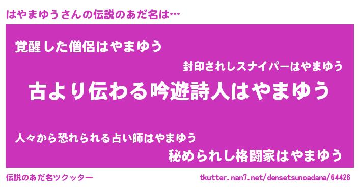 | 意味不明あだ名 | 『永久保存はやまゆう』『自称はやまゆう』 |