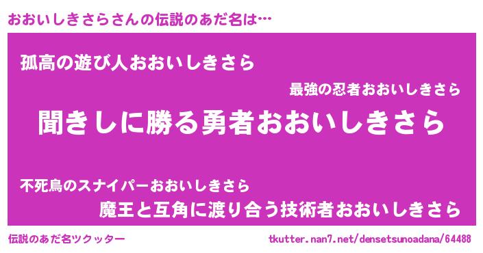 | ヒーロー風カッコイイあだ名 | 『仮面オオダー』『ネオオオイシキサラ』 |