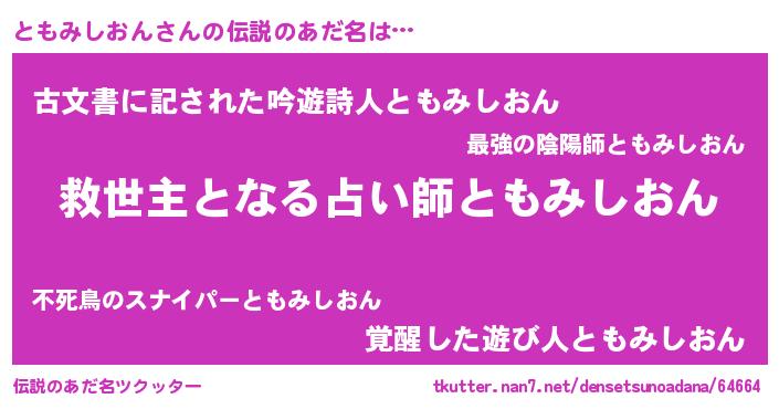 | 男性向けラノベタイトル風あだ名 | 『ともみしおん~年齢イコール彼女いない歴の魔法使い~』 |