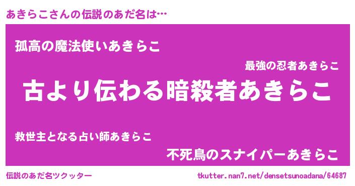 | 意味不明あだ名 | 『自称あきらこ』『永久保存あきらこ』 |