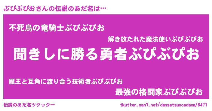 | 男性向けラノベタイトル風あだ名 | 『ぶぴぶぴおという概念が存在しない退屈な世界 』 |