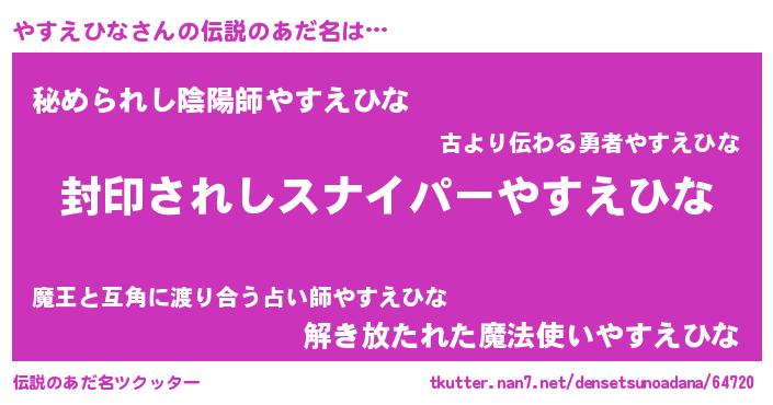 | 男性向けラノベタイトル風あだ名 | 『ヤスエヒナアートオンライン』 |
