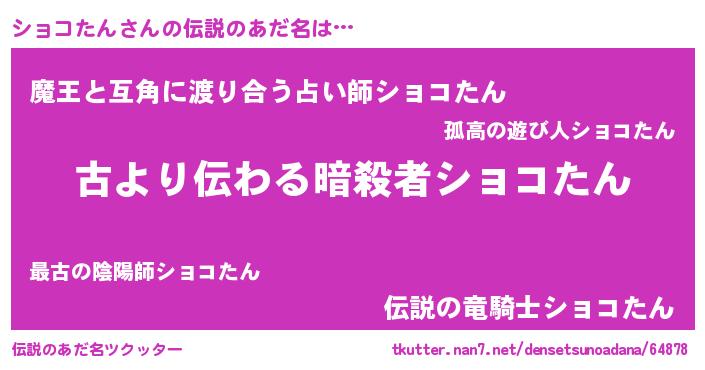 | 男性向けラノベタイトル風あだ名 | 『ショコたんという概念が存在しない退屈な世界 』 |