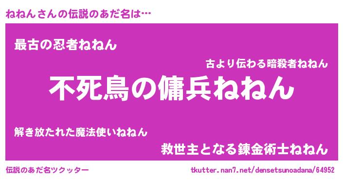 | 男性向けラノベタイトル風あだ名 | 『ねねんの憂鬱』『魔弾の王とねねん』 |