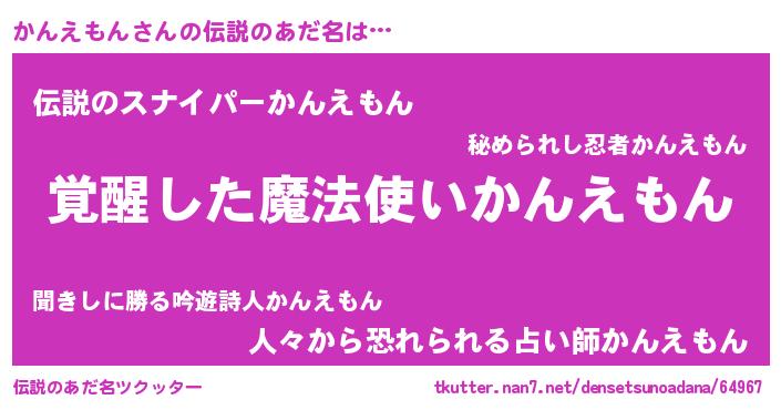 | 男性向けラノベタイトル風あだ名 | 『Re:かんえもんから始める異世界生活』 |