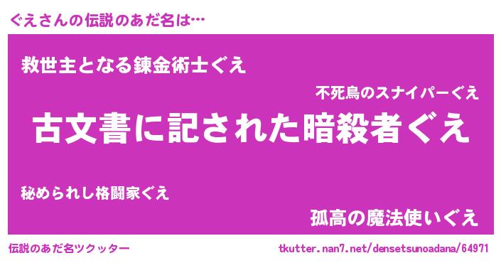 | ヒーロー風カッコイイあだ名 | 『ネオグエ』『天空の使者ぐえ』 |