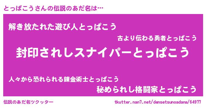 | ヒーロー風カッコイイあだ名 | 『仮面トッダー』『スーパートッパコウ』 |