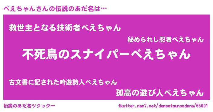 | 男性向けラノベタイトル風あだ名 | 『べえちゃんに滅ぼされるだけの簡単なお仕事です』 |