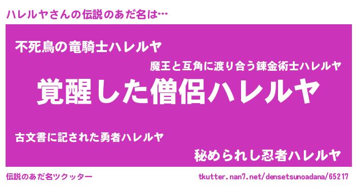 | 男性向けラノベタイトル風あだ名 | 『Re:ハレルヤから始める異世界生活』 |