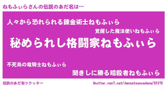 | 意味不明あだ名 | 『住所不定無職ねもふぃら(12歳)』 |