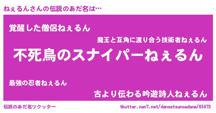 | 男性向けラノベタイトル風あだ名 | 『ねぇるんの憂鬱』 |
