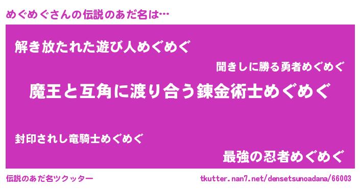 | ヒーロー風カッコイイあだ名 | 『慈愛の使者めぐめぐ』『幻影騎士メグ』 |