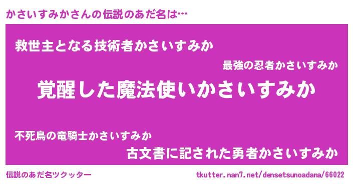 | ヒーロー風カッコイイあだ名 | 『天弓騎士カサ』『究極戦士カサイスミカ』 |
