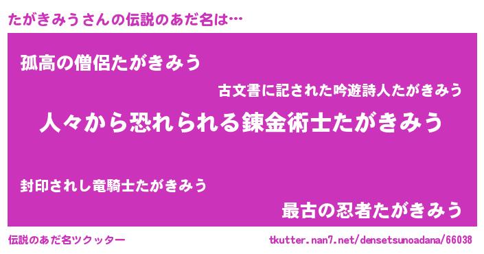 | ヒーロー風カッコイイあだ名 | 『正義の使者たがきみう』『魔戒騎士タガ』 |