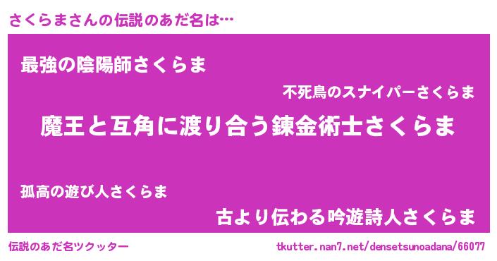 | 女子向けラノベタイトル風あだ名 | 『さくらま恋絵巻』『さくらまの婚約者』 |